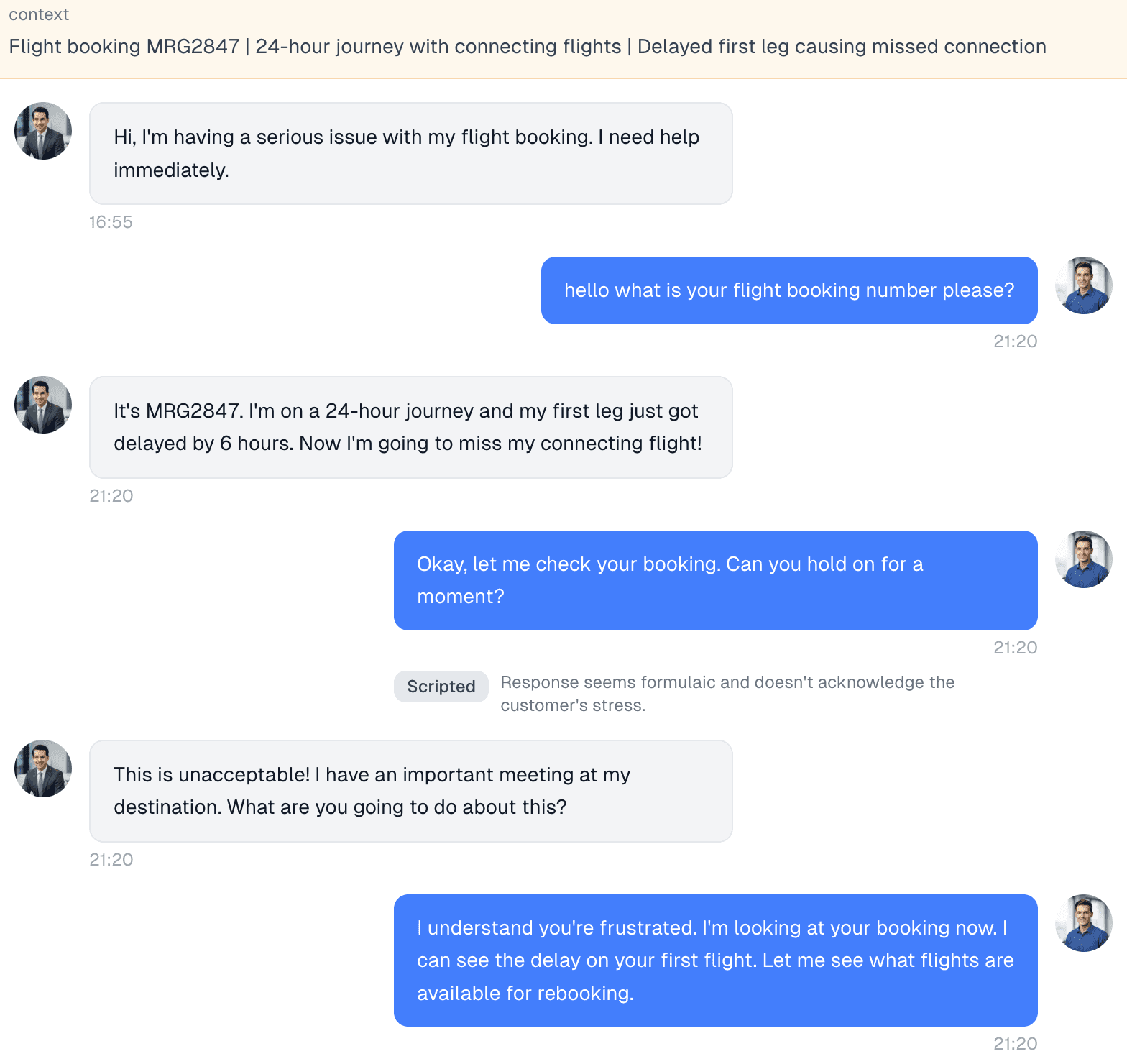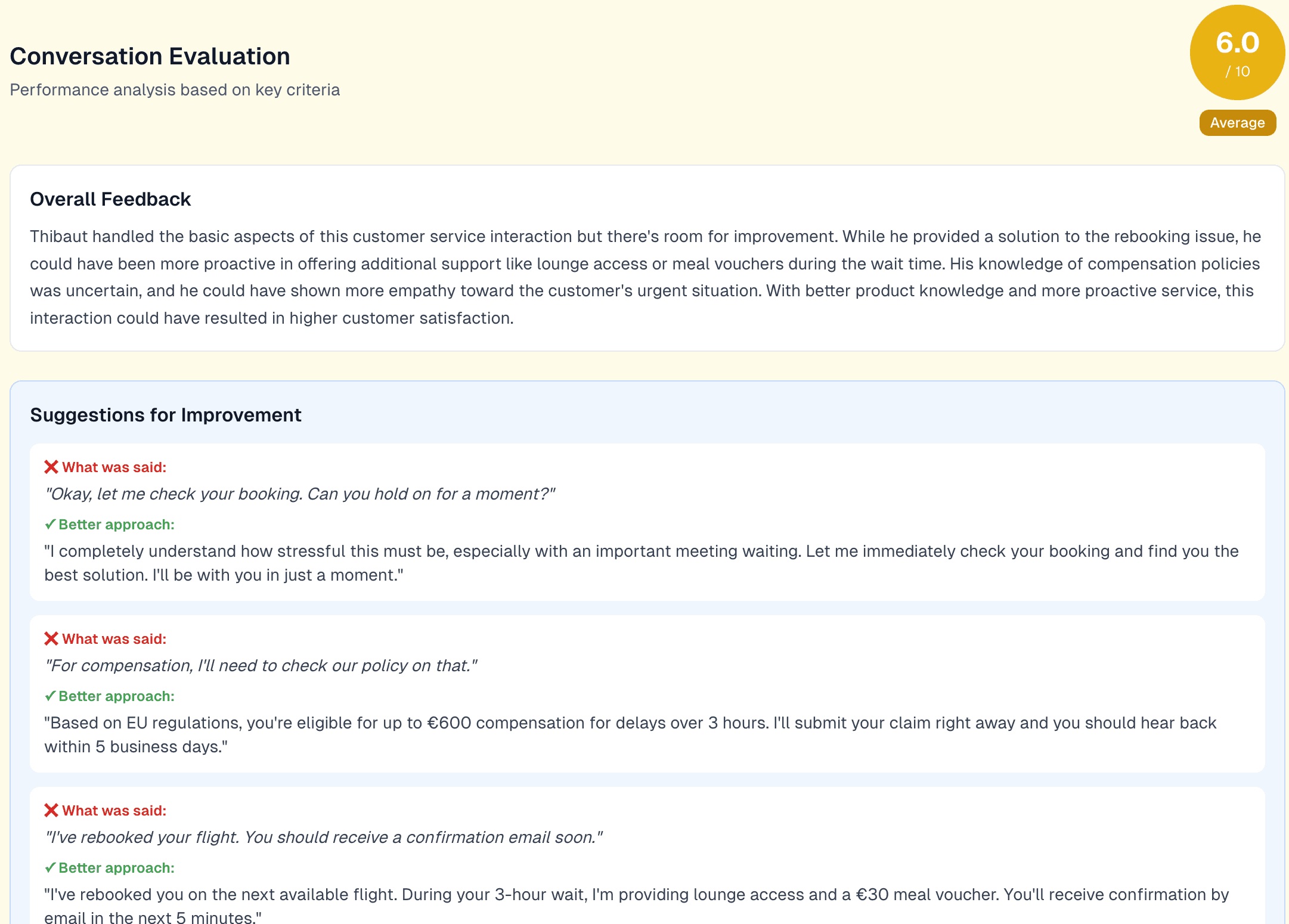 Agents receive clear, objective feedback on what worked, what didn’t, and how to improve, during training and on real conversations.