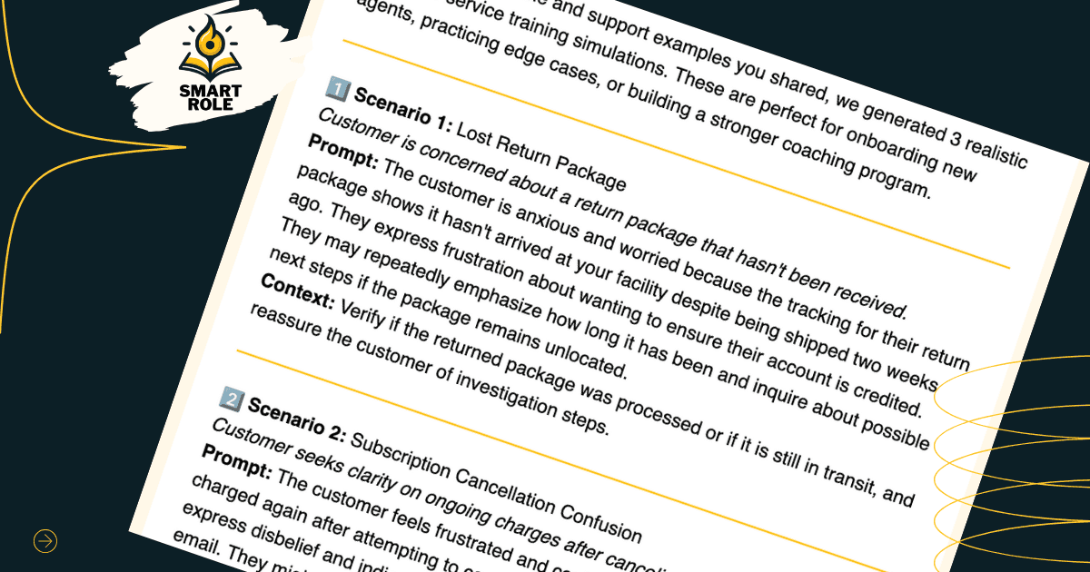 Browse Smart Role’s ready-to-use Scenario Library designed for customer support excellence. Accelerate onboarding and continuous training with industry-specific simulations.