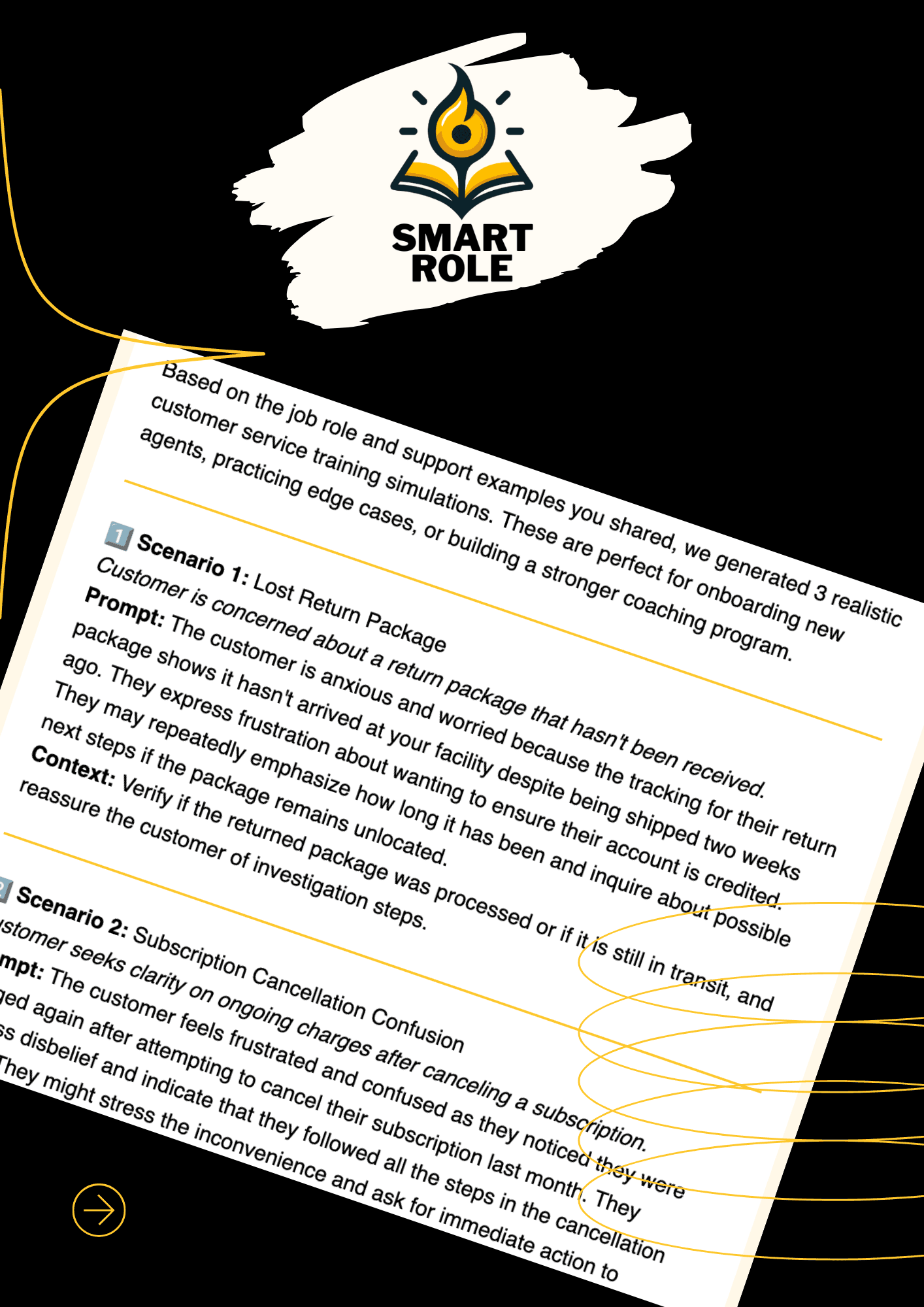 Generate tailored customer service simulations in seconds. Just drop in a job title, a product doc, and 5 past support conversations. We’ll generate 3 life-like training scenarios.